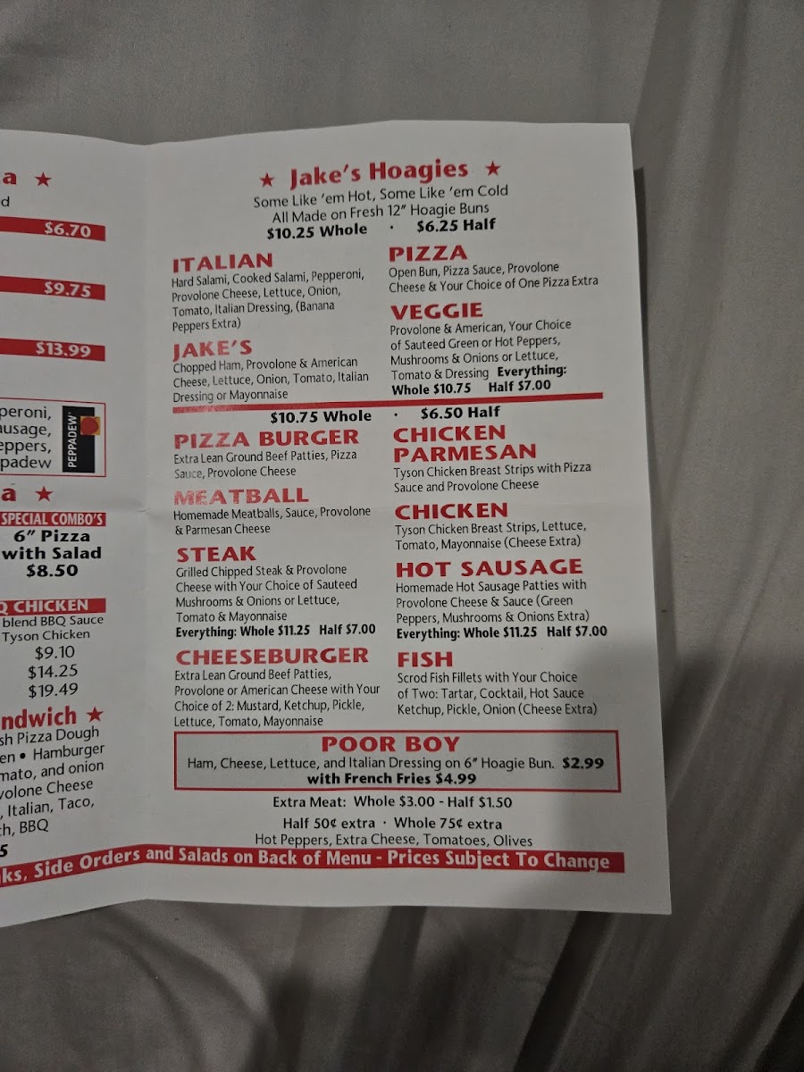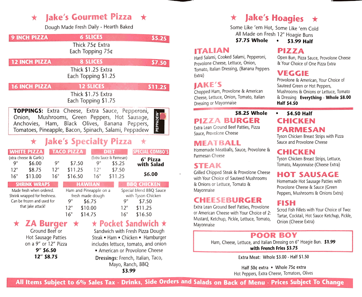 Introducing the menu at Jake's Pizza-NO DELIVERY, located at 428 Broad Ave in Belle Vernon, PA, is a delightful journey into the heart of Italian comfort food. With standout items like the Italian Jake's Pizza and Chicken Parmesan, each dish showcases a commitment to flavor and quality. The Meatball Steak and Hot Sausage are also customer favorites, further enriching the diverse selection.